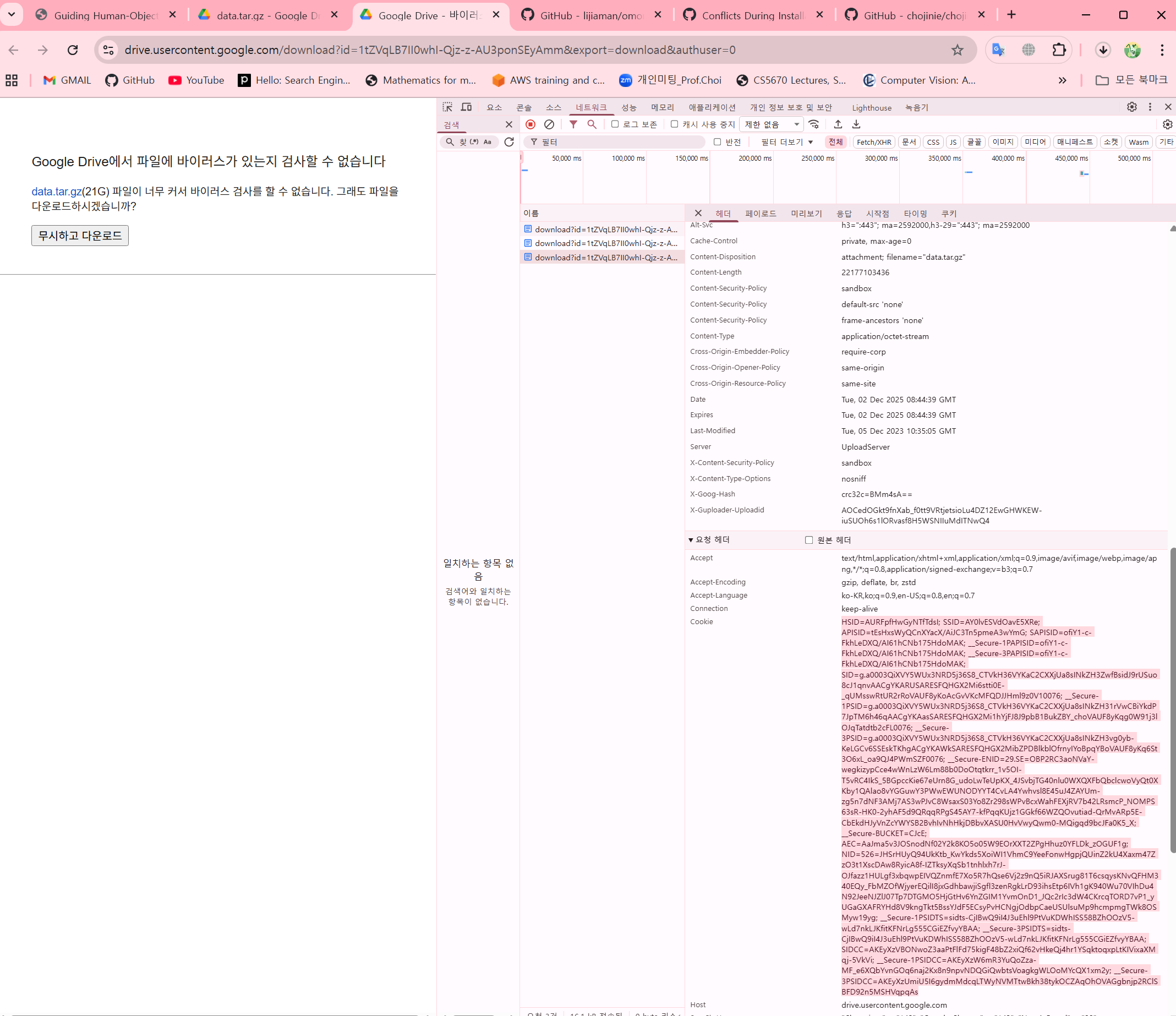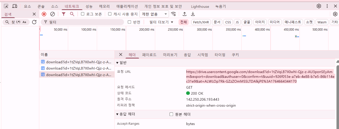 문제가 발생하면 Chrome에서 개발자 도구(F12) 를 열고 Network(네트워크) 탭으로 이동한다. 그 상태에서 Google Drive의 “무시하고 다운로드” 버튼을 클릭하면 실제 다운로드 요청과 쿠키 정보가 나타난다. 이미지와 같이 쿠키 값과 Request URL을 확보한다.